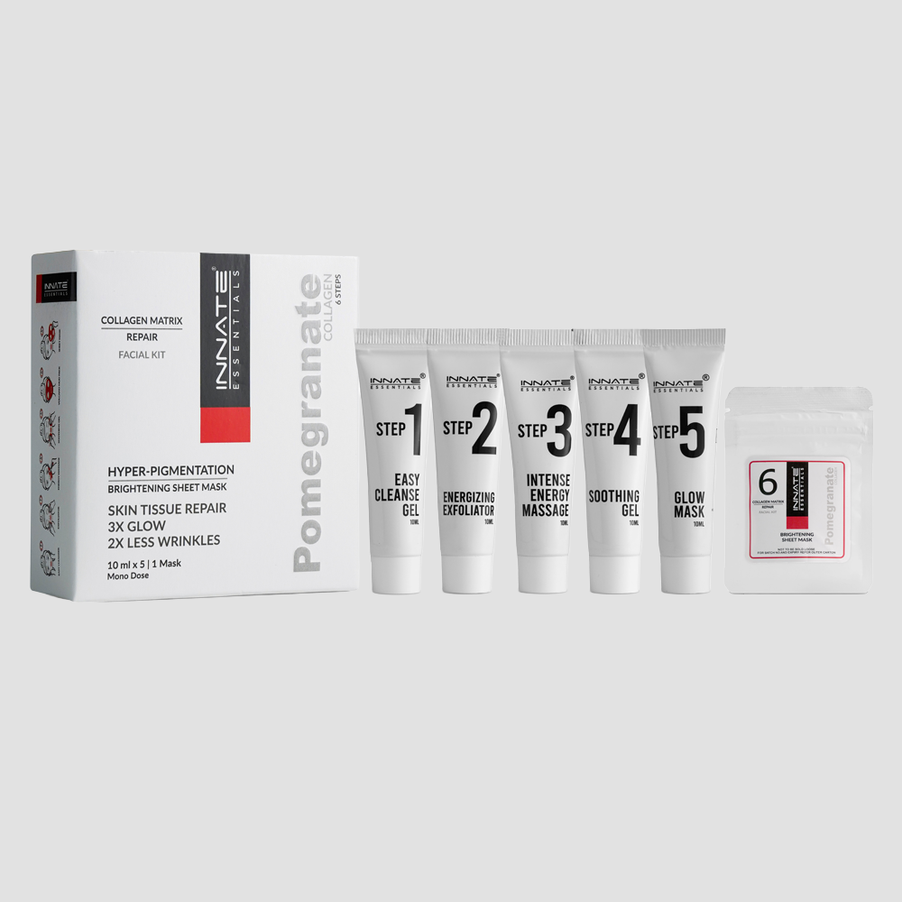 The Pomegranate Collagen Repair Facial is designed as a 15-day ritual. Using two facial kits in a month helps the skin work on pigmentation step by step.